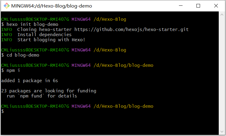D:/Hexo-Blog),在文件夹内右键鼠标,选择Open Git Bash here