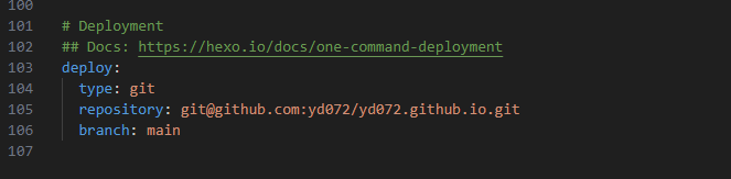 修改最后一行的配置,将repository修改为你自己的github项目地址即可,还有分支要改为main代表主分支(注意缩进)。