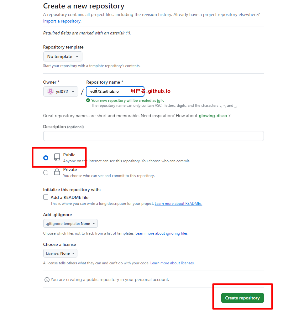 <用户名>.github.io(注意:前缀必须为用户名,此为预览博客需要,后期可修改仓库名) - 可见性必须选择