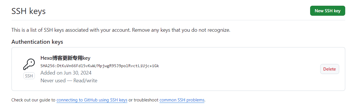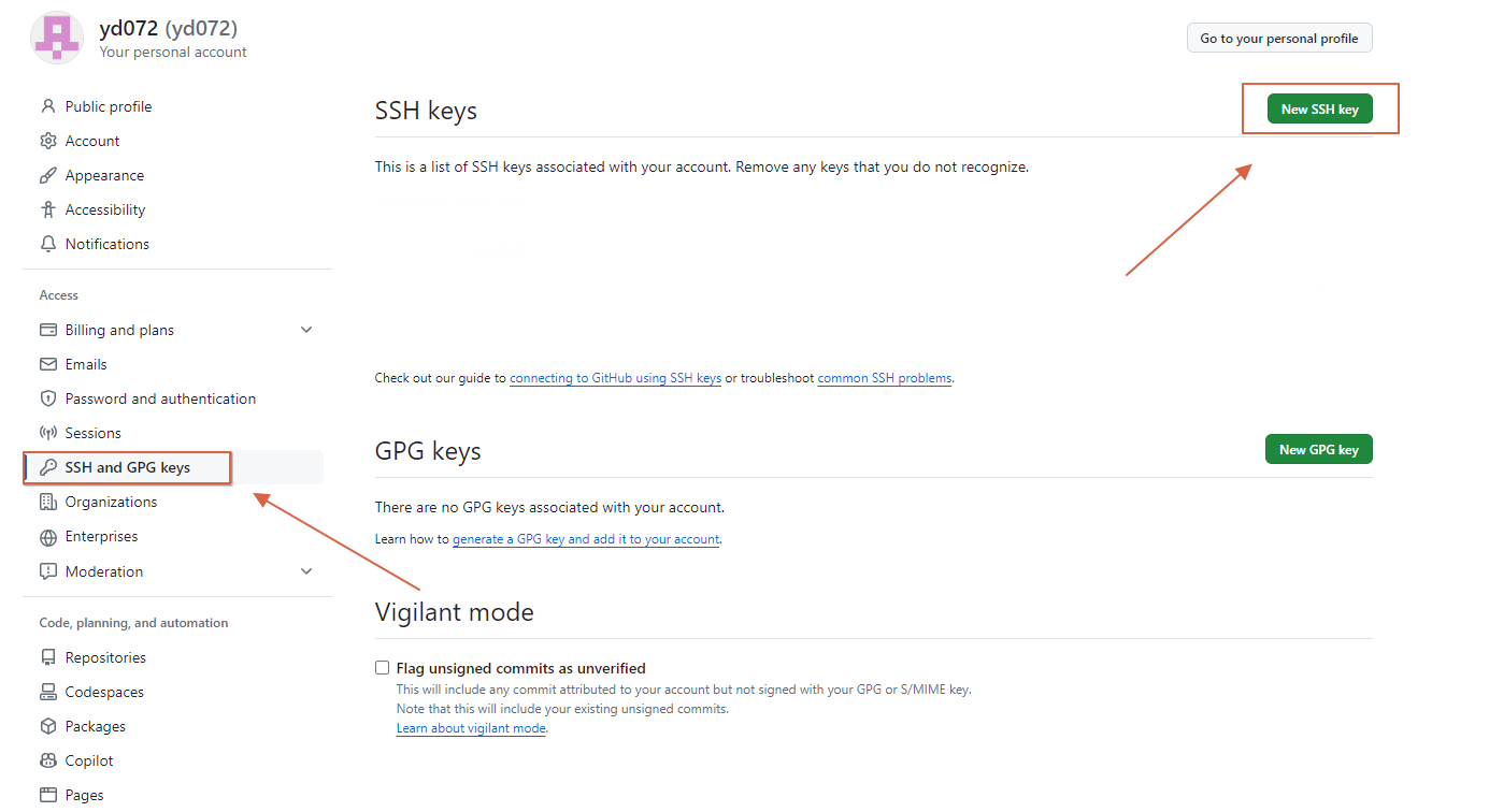 进入github,点击右上角头像 选择settings,进入设置页后选择 SSH and GPG keys,名字随便起,公钥填到Key那一栏。