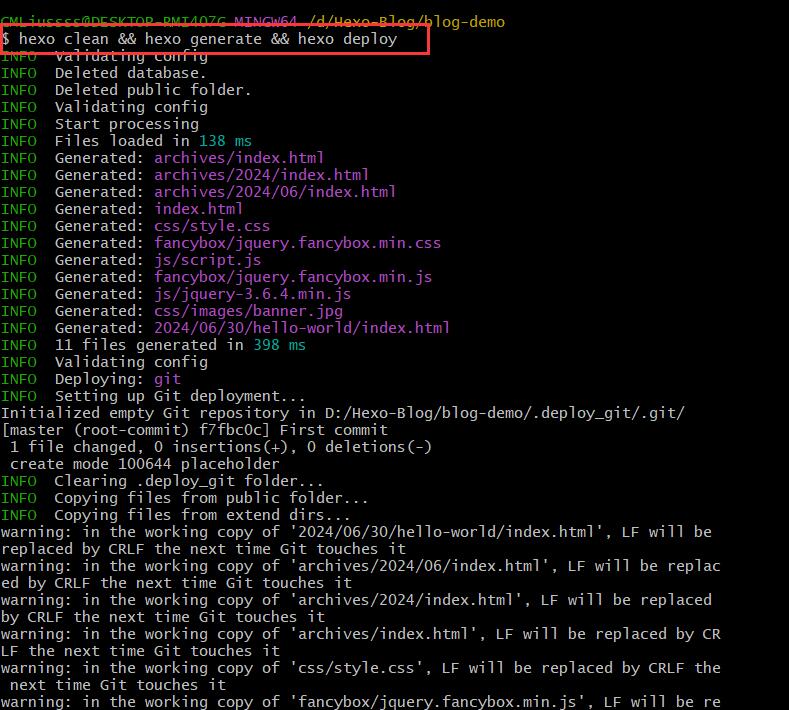 - 修改好配置后,运行如下命令,将代码部署到 GitHub(Hexo三连)。